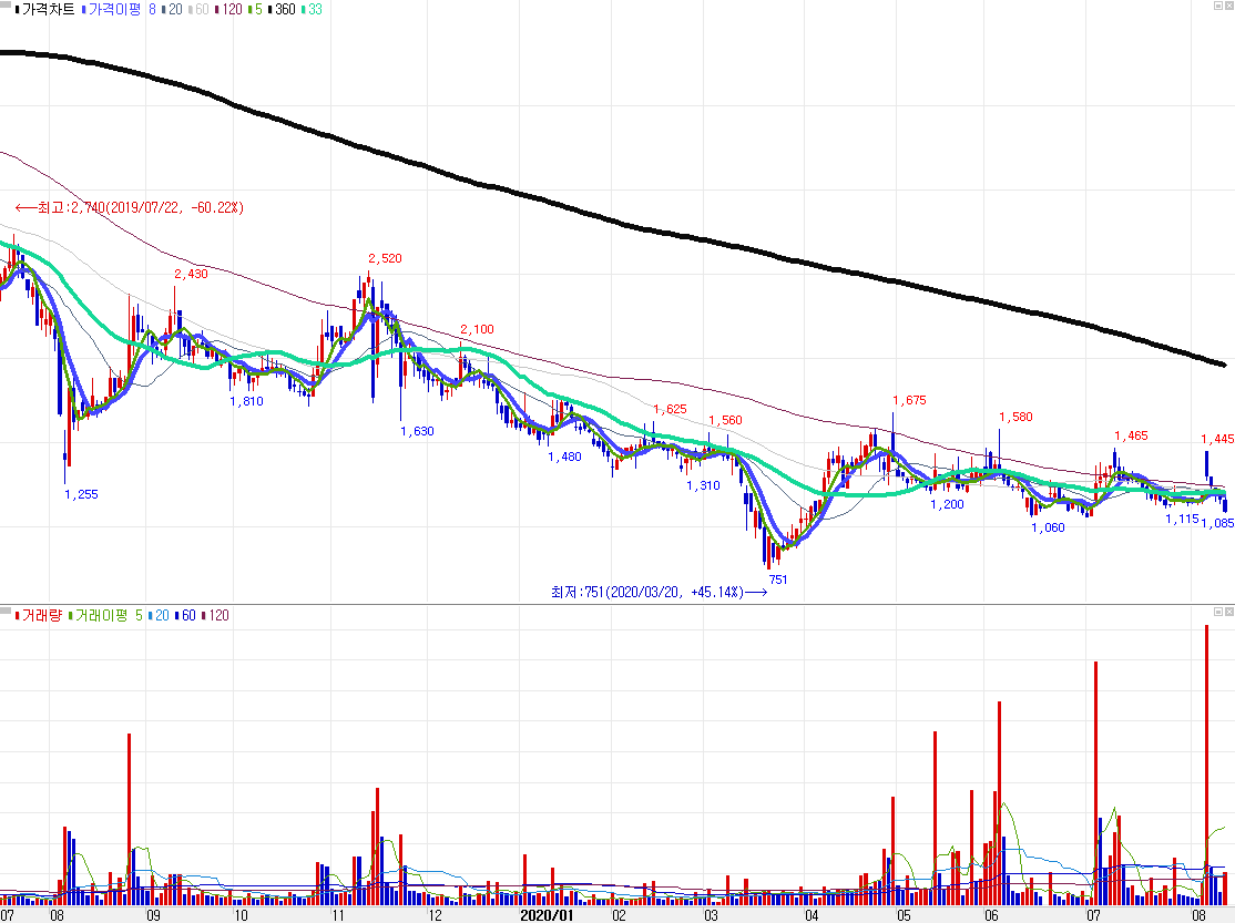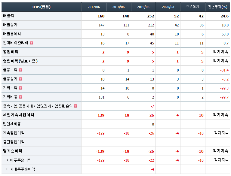 2020.08.05일에 유상증자를 했고, 그로 인해 주가 하락을 했다. 약간 웃긴 건 유상증자 발표를 5일에 했고 6일에 최대 20% 상승률을 보였었는데 이런 큰 폭의 상승도 이해가 안 가지만 부나방처럼 달려들어 고점에 묶인 개미들은 무슨 생각일까? 그냥 쉽게 이 회사의 매출액과 영업이익을 보더라도 꾸준히 적자가 계속되는 회사다. 요즘 유상증자가 상대적으로 호재로 보일 수 있지만 이런 재무제표를 갖고 있는 회사의 유상증자는 호재가 될 수 없지 않나?